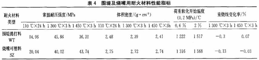圍堤粘渣嚴重,阻礙了立柱的行程,圍堤也出現開裂,清渣時容易出現破損。其所用搗打料的性能如下表。變形量0.6%時圍堤搗打料的荷重軟化溫度為1222℃變形量2%時僅為1517℃,變形溫度的范圍比較寬,開始變形的溫度低,從1222℃變形量達到0.6%,搗打料容易發軟,粘渣就比較嚴重。燒嘴周圍搗打料形態穩定,粘渣少,表明所用爐襯材料性較好,爐墻有內陷、開裂情況,與搗打料的性能有關。圍堤及燒嘴所用可塑料的性能如表4.從表4看出,變形量0.6%時,燒嘴可塑料的荷重軟化溫度為1316℃,而變形量達到2%時僅為1568℃,這個溫度區間比較大,荷重軟化溫度提高,對于減少粘渣有利。